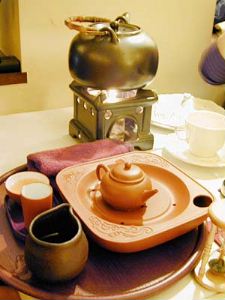 少し遅れてテーブルに運ばれてきた真花さんの中国茶は、茶器もあちらのもので本格的。お店の方のレクチャーが始まると、隣りに座らせていただいた私も真剣に耳を傾けます。紅茶をポットからカップに注ぐだけとはわけが違う中国茶。こちらのポットはとても大きく、何回も楽しめるので真花さんも大満足。